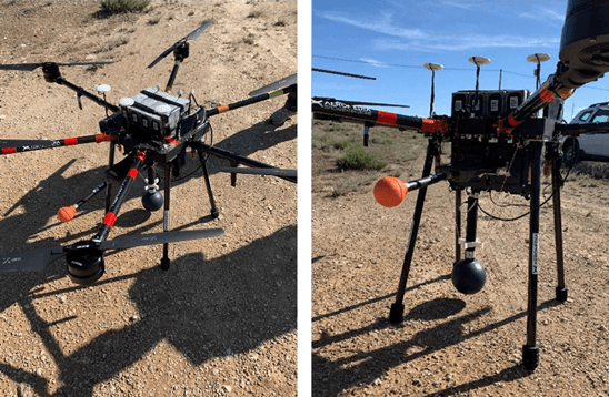 现场是使用OneAdvisor 800测试仪进行测量。这种测试仪安装在无人机上,能够移动到基站周围的各个兴趣点进行原位测量。该测试仪可以将频谱划分为不同的频段,从而通过为每种类型的蜂窝传输选择相关的频段来测量不同的技术,如 3G、4G LTE 或 5G NR。根据现场部署的技术,该测试仪还允许每个频带有不同的测量持续时间。由于无人机电池的限制,每次测量持续六分钟,至少有一分钟专门用于现场操作员使用的每个频段。下图为装有测试仪的无人机的地面视图。