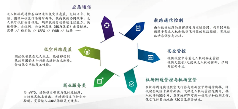 低空经济的通信需求包含应急通信、低空网络覆盖、商业服务类、航路通信控制、安全监管和机场附近管控与机场空管六大类。