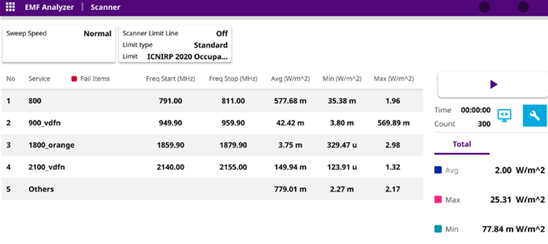 此外,为了提前了解现场每种技术的工作频率。在OneAdvisor 800用户界面,显示了共享该站点的不同运营商在特定频率下的几种服务。对于每个服务,获得一个功率密度值,使得每个技术的单独贡献和在每个选择的站点的总功率密度能够被确定。
